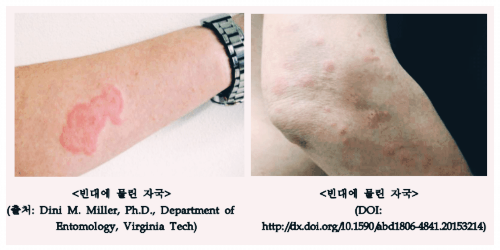 노린재 빈대과의 곤충으로 5~6mm의 길이로 상하체는 납작하게 눌린 형태를 하고 있는 갈색의 곤충입니다. 피를 흡혈하는 특징이 있는데 흡혈 이후에는 몸이 부풀어 오르고 몸 빛깔은 붉은색으로 바뀌게 됩니다. 만약 호텔에서 빈대를 발견했는데 몸의 빛깔이 붉은색이라면 물린 곳이 없는지 확인해봐야 합니다. 물린 후 흡혈로 인한 가려움증과 고열과 염증을 동반시킬 수 있고 2차 피부감염 등의 피해를 입을 수 있습니다.