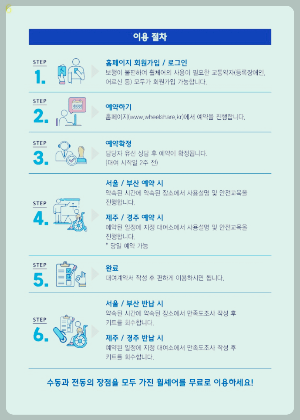 휠셰어 홈페이지에서 회원가입 후 예약이 가능하며 아래 신청자격에 적합한 경우 홈페이지 예약이 가능합니다.